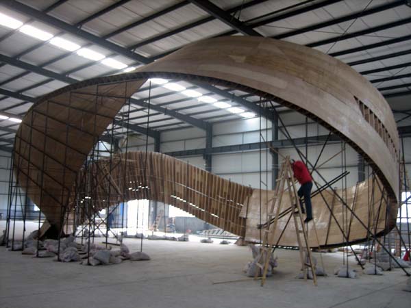 展館的設(shè)計形象湖南色彩濃厚,竹、紙、芙蓉花、桃花源、武陵源概念等湖南元素以及蔡倫造紙、隆平水稻、白石藝術(shù)等湖湘人文形象貫穿整個設(shè)計。環(huán)體主體材料為竹材,由國內(nèi)竹材制造供應(yīng)基地——湖南桃花江實業(yè)有限公司全程提供