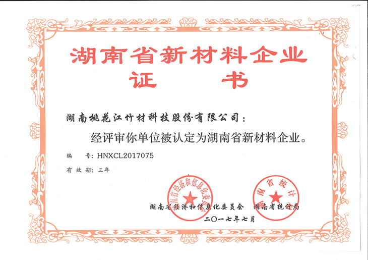 2017年7月,湖南省經(jīng)濟(jì)和信息化委員會(huì)、湖南省統(tǒng)計(jì)局為湖南桃花江竹材科技股份有限公司正式頒發(fā)“湖南省新材料企業(yè)”證書(shū)(證書(shū)編號(hào):HNXCL2017075)。湖南省新材料企業(yè)的認(rèn)定,標(biāo)志著湖南桃花江竹材科技在新型竹材領(lǐng)域的成績(jī)得到國(guó)家認(rèn)可與支持,是一項(xiàng)極具含金量的突破性榮譽(yù)。作為中國(guó)竹業(yè)龍頭企業(yè),湖南桃花江竹材科技一直走在新型竹材研發(fā)、運(yùn)用和推廣的前沿,為全球竹產(chǎn)業(yè)的發(fā)展持續(xù)貢獻(xiàn)力量。