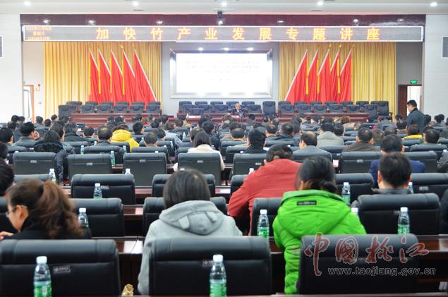 12月9日,黨政大樓附屬樓三樓會議室里,一場高規(guī)格的加快竹產(chǎn)業(yè)發(fā)展專題講座在這里舉行??h委副書記何軍田主持,縣領(lǐng)導(dǎo)唐學(xué)文、李質(zhì)彬、馬文才、陳震宇、胡國清、肖立新、張亮榮、劉武出席。副處級以上干部,縣直單位、鄉(xiāng)鎮(zhèn)負(fù)責(zé)人,林業(yè)系統(tǒng)工作者共400余人濟(jì)濟(jì)一堂,認(rèn)真聆聽了中國工程院院士、中國竹子加工利用首席科學(xué)家、南京林業(yè)大學(xué)教授張齊生和國家林業(yè)局竹子研發(fā)中心科研處處長、竹筍專家、高級工程師吳良如精彩而豐富的竹產(chǎn)業(yè)講課。